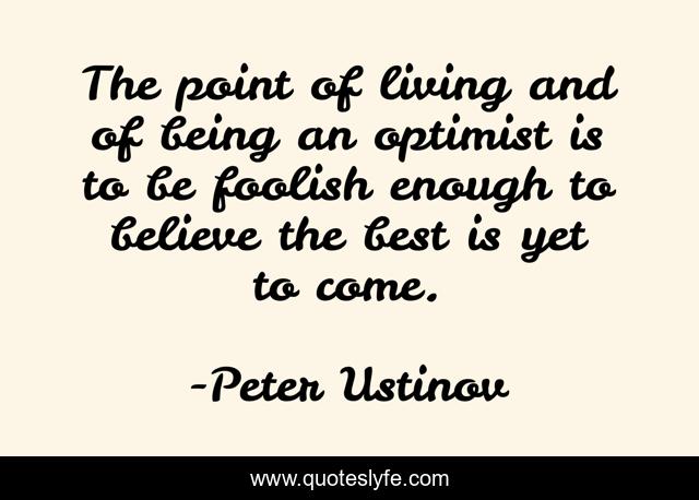 This page presents the quote "The point of living and of being an optimist is to be foolish enough to believe the best is yet to come.". Author of this quote is Peter Ustinov. This quote is about living, believe, point,.