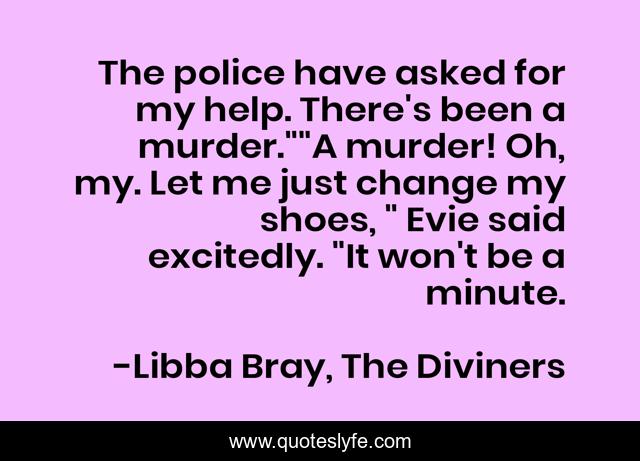 This page presents the quote "The police have asked for my help. There's been a murder.""A murder! Oh, my. Let me just change my shoes, " Evie said excitedly. "It won't be a minute.". Author of this quote is Libba Bray, The Diviners. This quote is about murder, shoes, evie,.