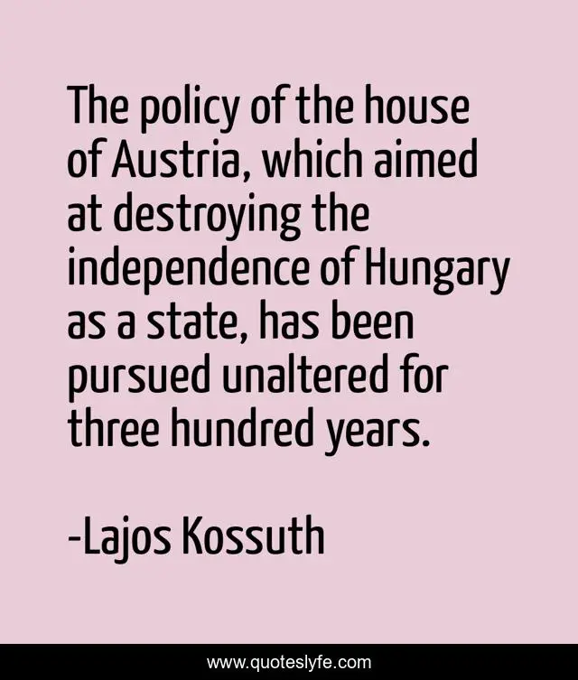 This page presents the quote "The policy of the house of Austria, which aimed at destroying the independence of Hungary as a state, has been pursued unaltered for three hundred years.". Author of this quote is Lajos Kossuth. This quote is about house, three, years,.