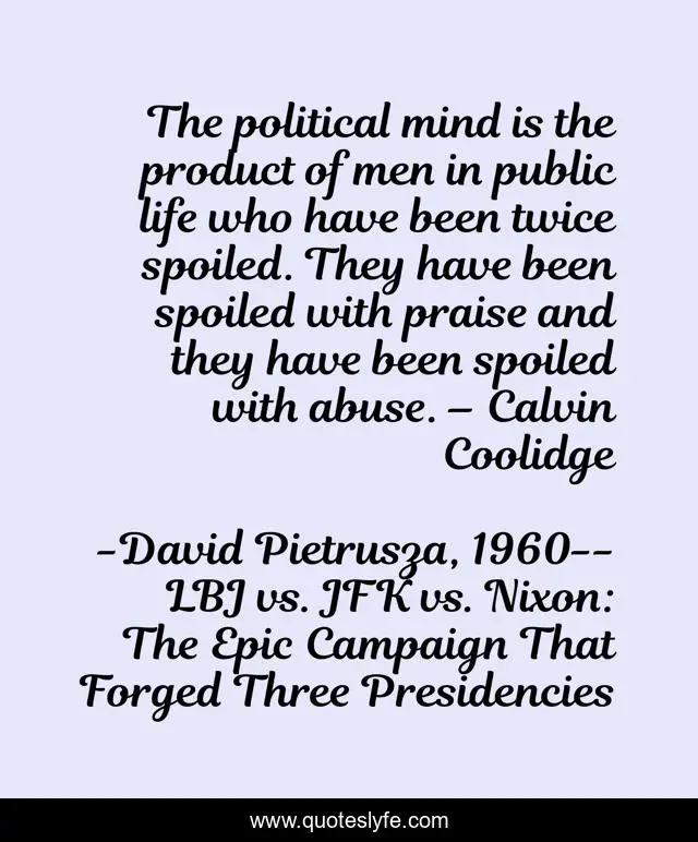 This page presents the quote "The political mind is the product of men in public life who have been twice spoiled. They have been spoiled with praise and they have been spoiled with abuse. – Calvin Coolidge". Author of this quote is David Pietrusza, 1960--LBJ vs. JFK vs. Nixon: The Epic Campaign That Forged Three Presidencies. This quote is about leadership, influence, peer-pressure,.