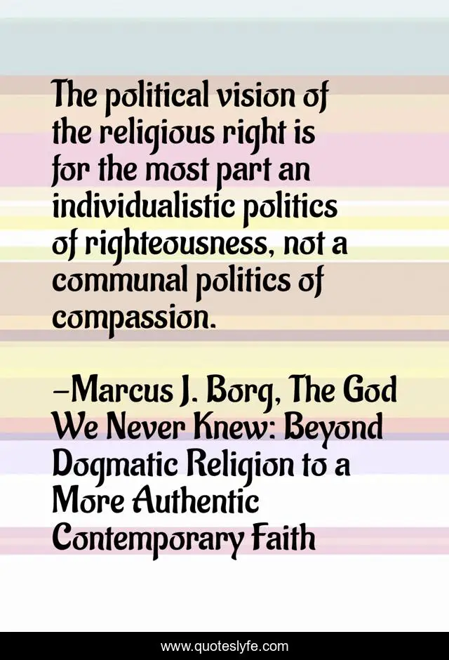 This page presents the quote "The political vision of the religious right is for the most part an individualistic politics of righteousness, not a communal politics of compassion.". Author of this quote is Marcus J. Borg, The God We Never Knew: Beyond Dogmatic Religion to a More Authentic Contemporary Faith. This quote is about compassion, politics, righteousness, religious-right, individualism,.