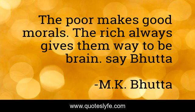 This page presents the quote "The poor makes good morals. The rich always gives them way to be brain. say Bhutta". Author of this quote is M.K. Bhutta. This quote is about poor, morals-of-m-k-bhutta, rich,.