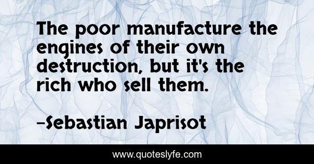 This page presents the quote "The poor manufacture the engines of their own destruction, but it's the rich who sell them.". Author of this quote is Sebastian Japrisot. This quote is about poor, self-destruction, war, rich,.