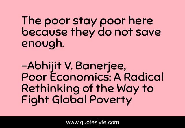 This page presents the quote "The poor stay poor here because they do not save enough.". Author of this quote is Abhijit V. Banerjee, Poor Economics: A Radical Rethinking of the Way to Fight Global Poverty. This quote is about poor, economics, poverty, social-change,.