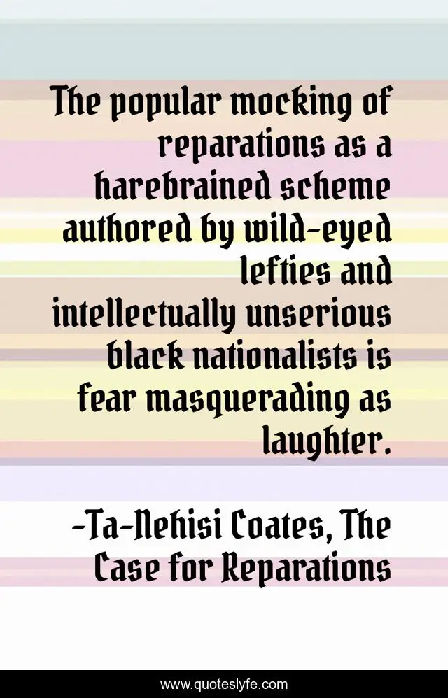 This page presents the quote "The popular mocking of reparations as a harebrained scheme authored by wild-eyed lefties and intellectually unserious black nationalists is fear masquerading as laughter.". Author of this quote is Ta-Nehisi Coates, The Case for Reparations. This quote is about slavery-in-the-united-states, white-guilt, racism, institutionalized-racism, hr-40, prejudice, reparations, american-history, whiteness,.