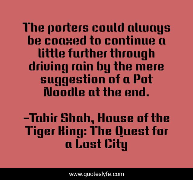 This page presents the quote "The porters could always be coaxed to continue a little further through driving rain by the mere suggestion of a Pot Noodle at the end.". Author of this quote is Tahir Shah, House of the Tiger King: The Quest for a Lost City. This quote is about food, endurance, adventure,.