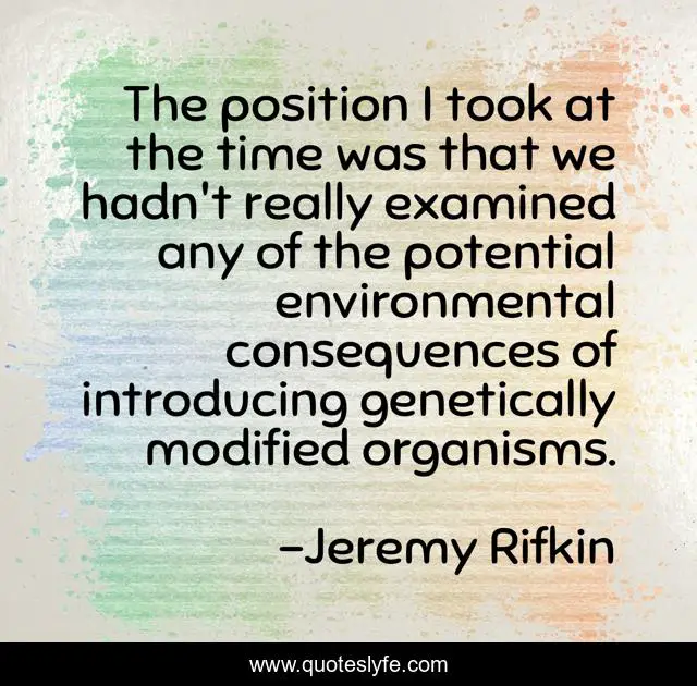 This page presents the quote "The position I took at the time was that we hadn't really examined any of the potential environmental consequences of introducing genetically modified organisms.". Author of this quote is Jeremy Rifkin. This quote is about potential, time,.