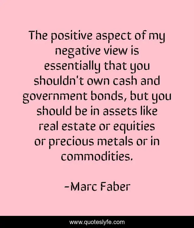 This page presents the quote "The positive aspect of my negative view is essentially that you shouldn't own cash and government bonds, but you should be in assets like real estate or equities or precious metals or in commodities.". Author of this quote is Marc Faber. This quote is about real estate, government,.