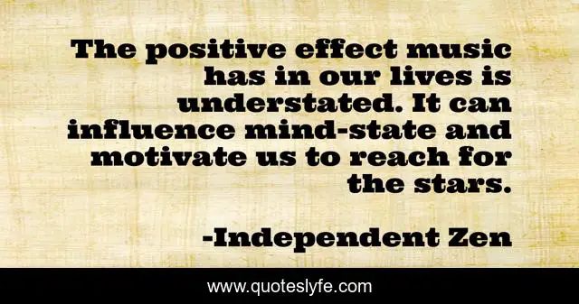 This page presents the quote "The positive effect music has in our lives is understated. It can influence mind-state and motivate us to reach for the stars.". Author of this quote is Independent Zen. This quote is about positive-mindset, power-of-music, motivation, independent-zen,.