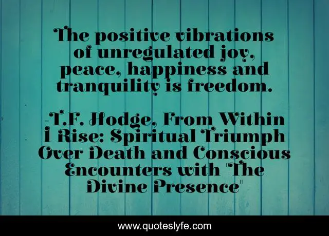This page presents the quote "The positive vibrations of unregulated joy, peace, happiness and tranquility is freedom.". Author of this quote is T.F. Hodge, From Within I Rise: Spiritual Triumph Over Death and Conscious Encounters with "The Divine Presence". This quote is about freedom, positivity, peace, quotes, vibrations, tranquility, joy, happiness,.