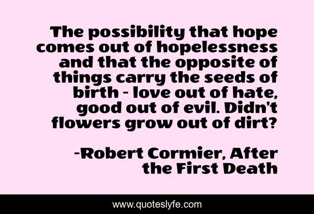 This page presents the quote "The possibility that hope comes out of hopelessness and that the opposite of things carry the seeds of birth - love out of hate, good out of evil. Didn't flowers grow out of dirt?". Author of this quote is Robert Cormier, After the First Death. This quote is about action, physchotic-thriller,.