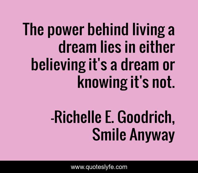 "Richelle E. Goodrich, Smile Anyway Quotes." Quoteslyfe.com, 2025. Mon. 08 Dec. 2025. <https://www.quoteslyfe.com/quote/The-power-behind-living-a-dream-lies-105827>.