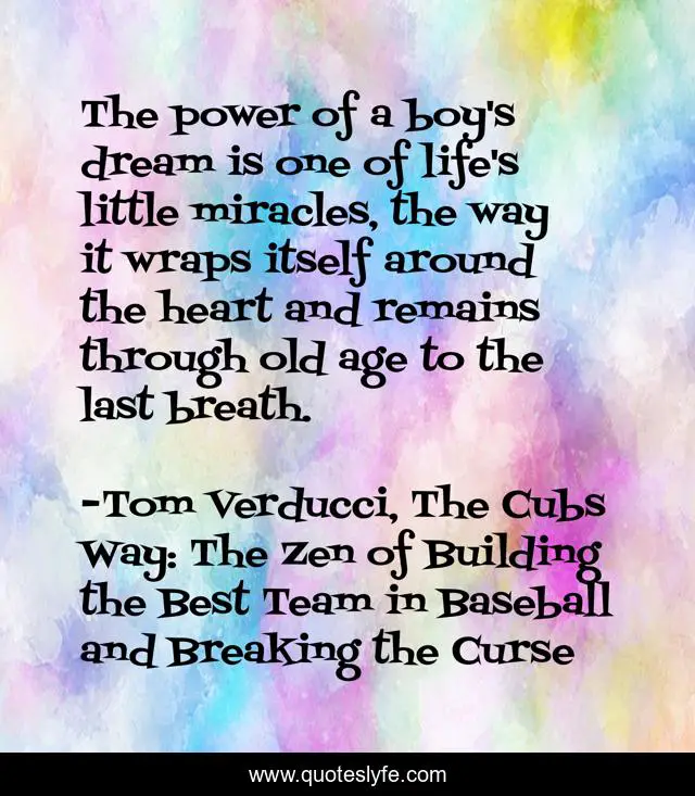 This page presents the quote "The power of a boy's dream is one of life's little miracles, the way it wraps itself around the heart and remains through old age to the last breath.". Author of this quote is Tom Verducci, The Cubs Way: The Zen of Building the Best Team in Baseball and Breaking the Curse. .