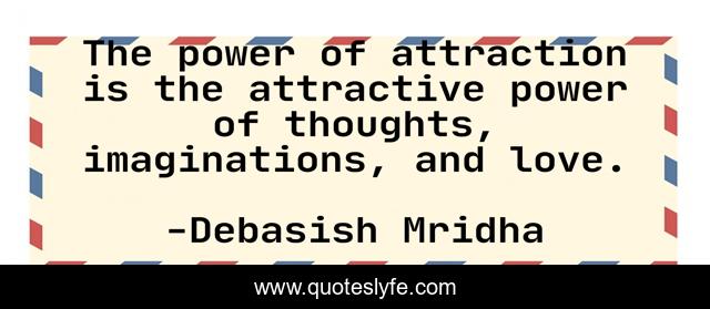 This page presents the quote "The power of attraction is the attractive power of thoughts, imaginations, and love.". Author of this quote is Debasish Mridha. This quote is about love, imaginations, power-of-attraction, philosophy, debasish-mridha, quotes, thoughts, inspirational, enthusiasm,.