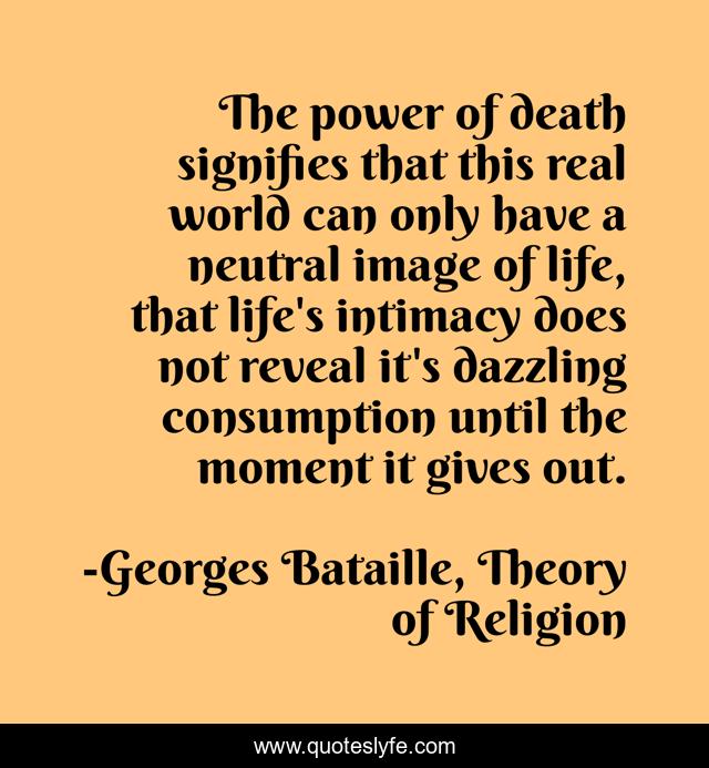 This page presents the quote "The power of death signifies that this real world can only have a neutral image of life, that life's intimacy does not reveal it's dazzling consumption until the moment it gives out.". Author of this quote is Georges Bataille, Theory of Religion. This quote is about enthusiasm, philosophy, inspirational,.