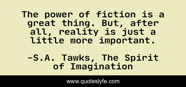 This page presents the quote "The power of fiction is a great thing. But, after all, reality is just a little more important.". Author of this quote is S.A. Tawks, The Spirit of Imagination. This quote is about spirituality, author, writing, imagination, reader, reading,.