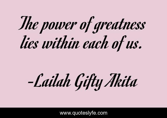 This page presents the quote "The power of greatness lies within each of us.". Author of this quote is Lailah Gifty Akita. This quote is about inner-beauty, inner-voice, inner-life, power-of-thoughts, greatness, inner-strength,.