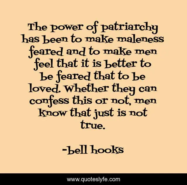 This page presents the quote "The power of patriarchy has been to make maleness feared and to make men feel that it is better to be feared that to be loved. Whether they can confess this or not, men know that just is not true.". Author of this quote is bell hooks. This quote is about relationships, love, men, fear, affection, patriarchy,.