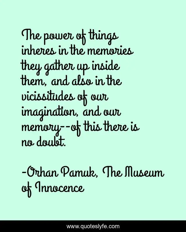 This page presents the quote "The power of things inheres in the memories they gather up inside them, and also in the vicissitudes of our imagination, and our memory--of this there is no doubt.". Author of this quote is Orhan Pamuk, The Museum of Innocence. This quote is about memories, imagination, things, memory,.