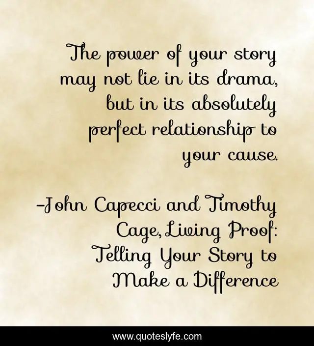 This page presents the quote "The power of your story may not lie in its drama, but in its absolutely perfect relationship to your cause.". Author of this quote is John Capecci and Timothy Cage, Living Proof: Telling Your Story to Make a Difference. This quote is about activism, advocate, story, storytelling, advocacy,.
