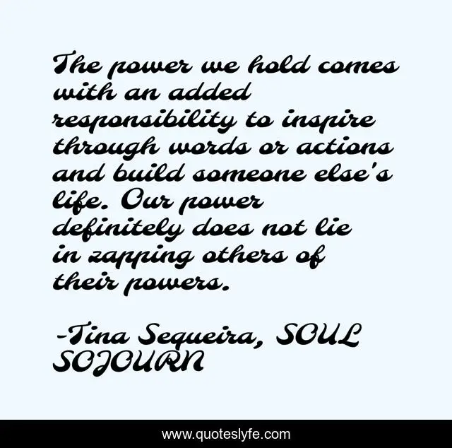 This page presents the quote "The power we hold comes with an added responsibility to inspire through words or actions and build someone else's life. Our power definitely does not lie in zapping others of their powers.". Author of this quote is Tina Sequeira, SOUL SOJOURN. .