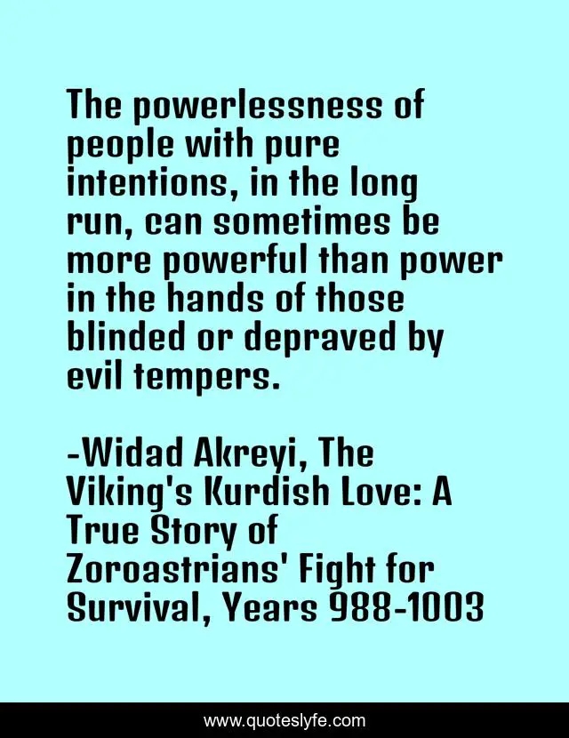 This page presents the quote "The powerlessness of people with pure intentions, in the long run, can sometimes be more powerful than power in the hands of those blinded or depraved by evil tempers.". Author of this quote is Widad Akreyi, The Viking's Kurdish Love: A True Story of Zoroastrians' Fight for Survival, Years 988-1003. This quote is about zoroastrians, vikings, power-of-thoughts, viking-romance, dr-widad, widad-akreyi, inspirational, enthusiasm, kurds,.