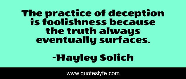 This page presents the quote "The practice of deception is foolishness because the truth always eventually surfaces.". Author of this quote is Hayley Solich. This quote is about justice, truth-of-life, lying, truth, deceptions,.