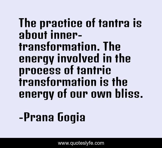 This page presents the quote "The practice of tantra is about inner-transformation. The energy involved in the process of tantric transformation is the energy of our own bliss.". Author of this quote is Prana Gogia. This quote is about tantra, bliss, transformation,.