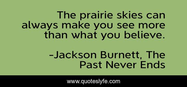 This page presents the quote "The prairie skies can always make you see more than what you believe.". Author of this quote is Jackson Burnett, The Past Never Ends. This quote is about infinity, belief, unlimited, great-plains, skies, prairie,.