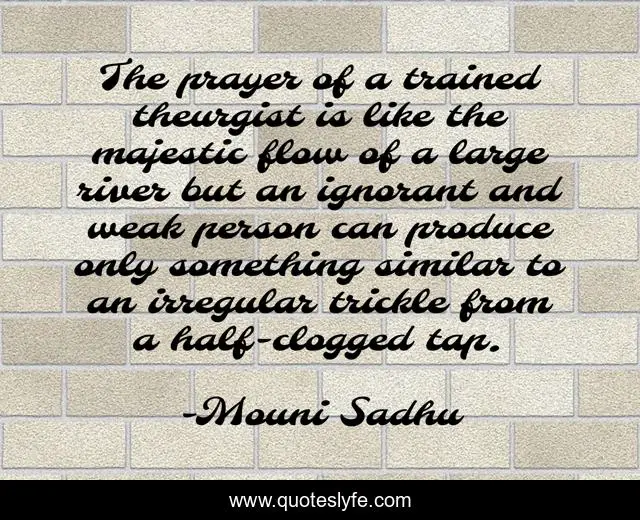 This page presents the quote "The prayer of a trained theurgist is like the majestic flow of a large river but an ignorant and weak person can produce only something similar to an irregular trickle from a half-clogged tap.". Author of this quote is Mouni Sadhu. .