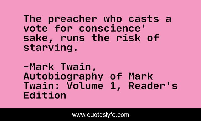 This page presents the quote "The preacher who casts a vote for conscience' sake, runs the risk of starving.". Author of this quote is Mark Twain, Autobiography of Mark Twain: Volume 1, Reader's Edition. This quote is about conscience, preachers, voting,.