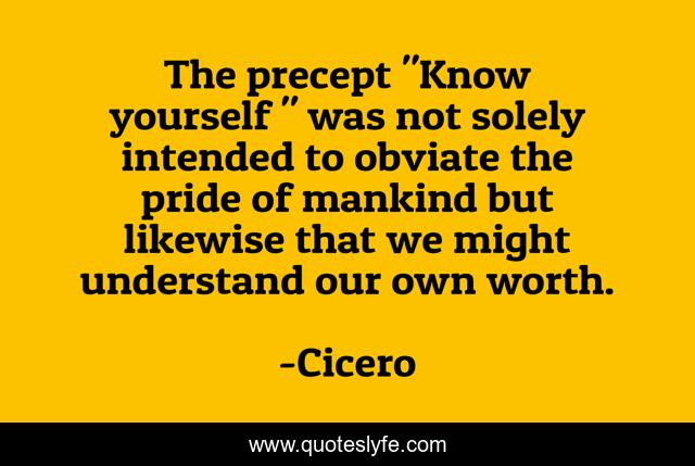This page presents the quote "The precept "Know yourself " was not solely intended to obviate the pride of mankind but likewise that we might understand our own worth.". Author of this quote is Cicero. This quote is about self, knowledge,.