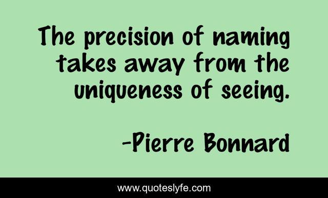 This page presents the quote "The precision of naming takes away from the uniqueness of seeing.". Author of this quote is Pierre Bonnard. This quote is about seeing, uniqueness,.