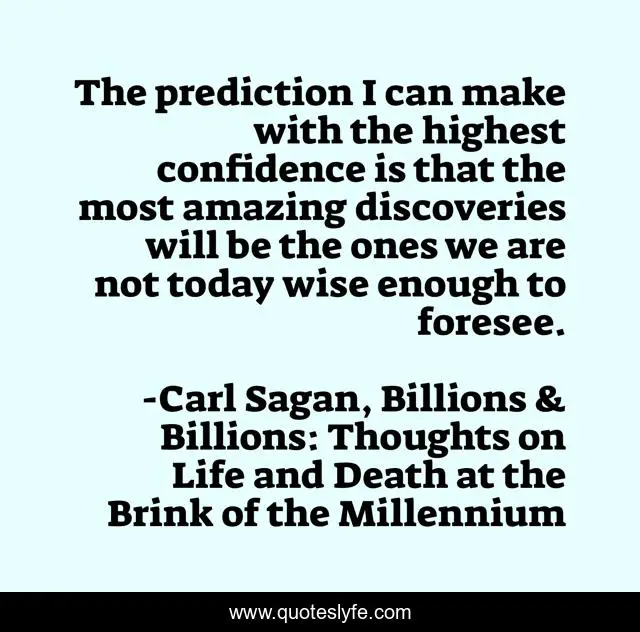 This page presents the quote "The prediction I can make with the highest confidence is that the most amazing discoveries will be the ones we are not today wise enough to foresee.". Author of this quote is Carl Sagan, Billions & Billions: Thoughts on Life and Death at the Brink of the Millennium. .