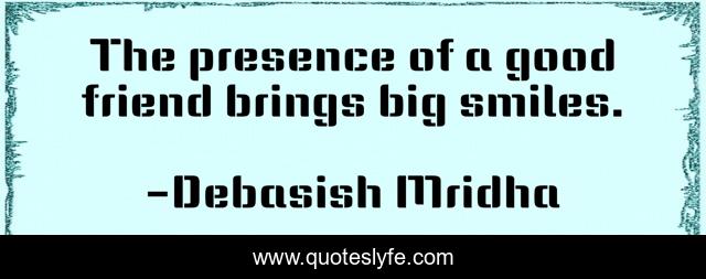 This page presents the quote "The presence of a good friend brings big smiles.". Author of this quote is Debasish Mridha. This quote is about smiles, philosophy, debasish-mridha, presence-of-a-good-friend, quotes, importance-of-a-smile, inspirational, enthusiasm, good-friend,.