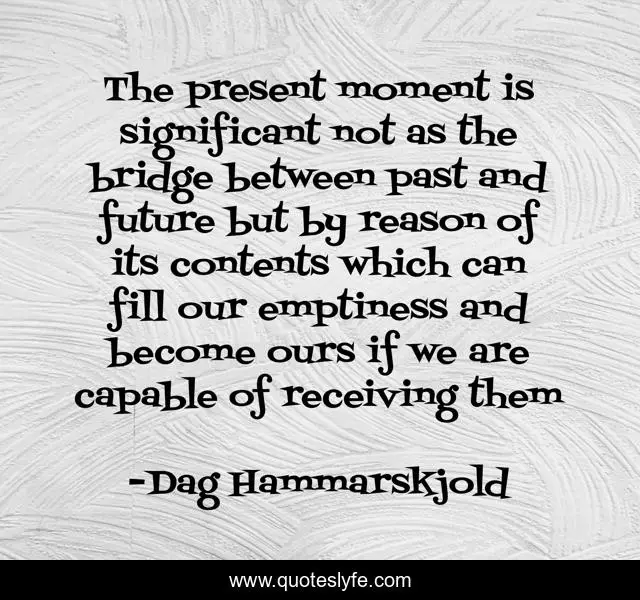 This page presents the quote "The present moment is significant not as the bridge between past and future but by reason of its contents which can fill our emptiness and become ours if we are capable of receiving them". Author of this quote is Dag Hammarskjold. .