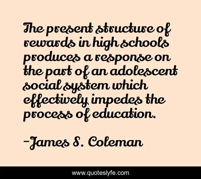 This page presents the quote "The present structure of rewards in high schools produces a response on the part of an adolescent social system which effectively impedes the process of education.". Author of this quote is James S. Coleman. This quote is about process, response, present,.
