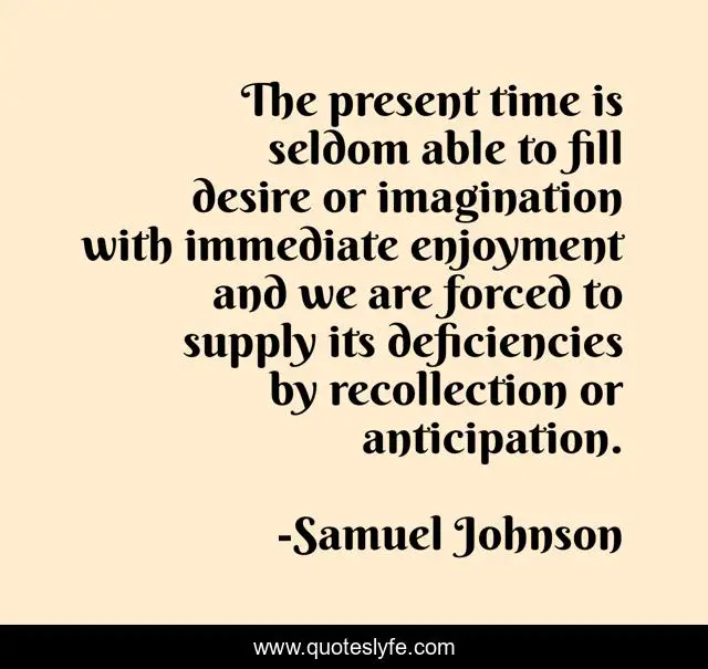 This page presents the quote "The present time is seldom able to fill desire or imagination with immediate enjoyment and we are forced to supply its deficiencies by recollection or anticipation.". Author of this quote is Samuel Johnson. .