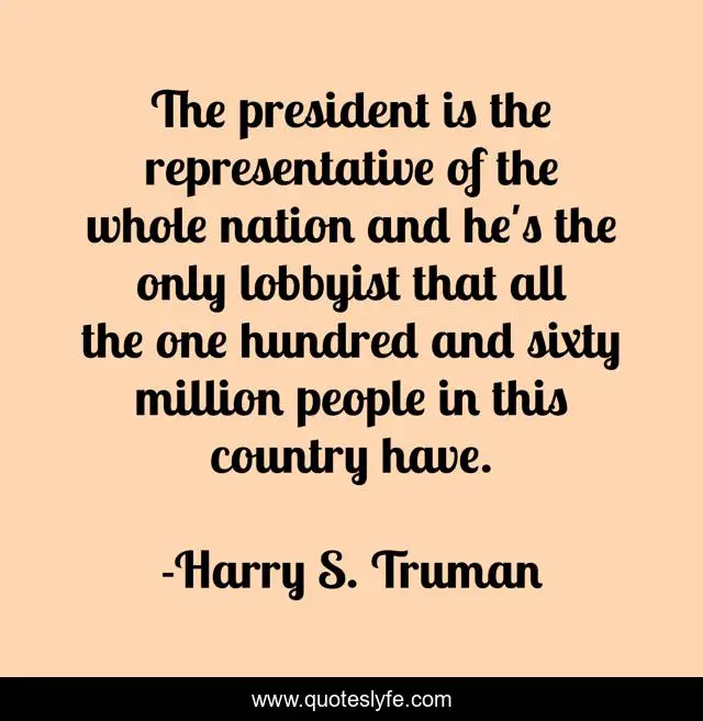This page presents the quote "The president is the representative of the whole nation and he's the only lobbyist that all the one hundred and sixty million people in this country have.". Author of this quote is Harry S. Truman. .