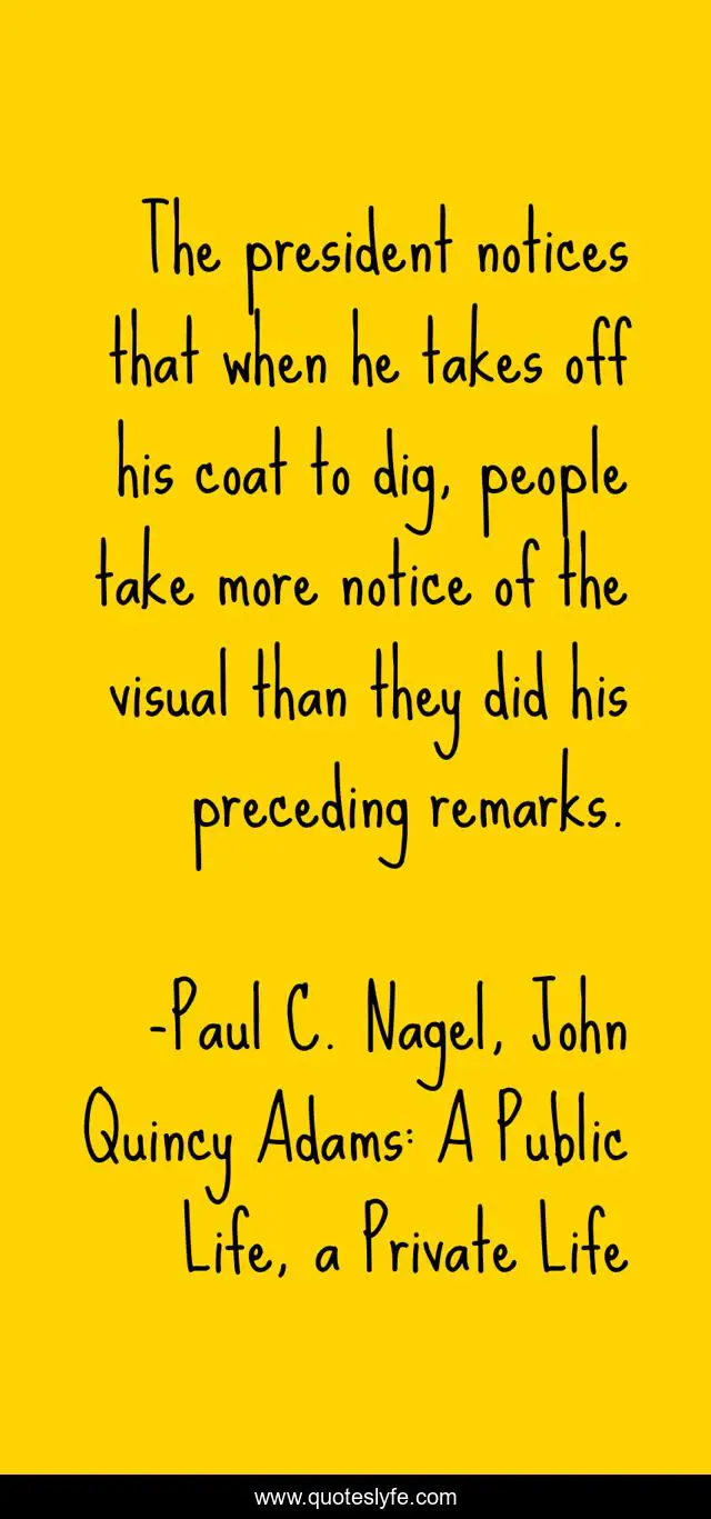 This page presents the quote "The president notices that when he takes off his coat to dig, people take more notice of the visual than they did his preceding remarks.". Author of this quote is Paul C. Nagel, John Quincy Adams: A Public Life, a Private Life. This quote is about vocation, calling, work, servant-leadership, humility, discipleship,.