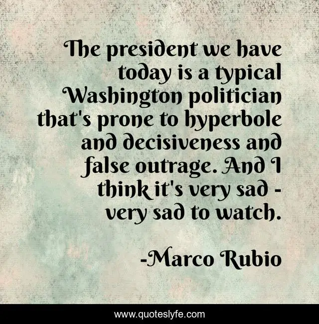 This page presents the quote "The president we have today is a typical Washington politician that's prone to hyperbole and decisiveness and false outrage. And I think it's very sad - very sad to watch.". Author of this quote is Marco Rubio. This quote is about president, think, today,.
