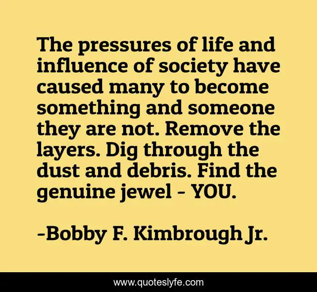 This page presents the quote "The pressures of life and influence of society have caused many to become something and someone they are not. Remove the layers. Dig through the dust and debris. Find the genuine jewel - YOU.". Author of this quote is Bobby F. Kimbrough Jr.. This quote is about motivation, strength, god, survival, midnight, spiritual, existence,.