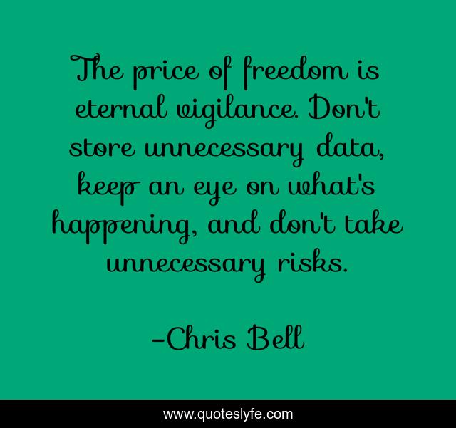 This page presents the quote "The price of freedom is eternal vigilance. Don't store unnecessary data, keep an eye on what's happening, and don't take unnecessary risks.". Author of this quote is Chris Bell. This quote is about eye, data, risks,.