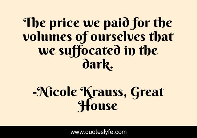 This page presents the quote "The price we paid for the volumes of ourselves that we suffocated in the dark.". Author of this quote is Nicole Krauss, Great House. This quote is about dark, self, the-self,.