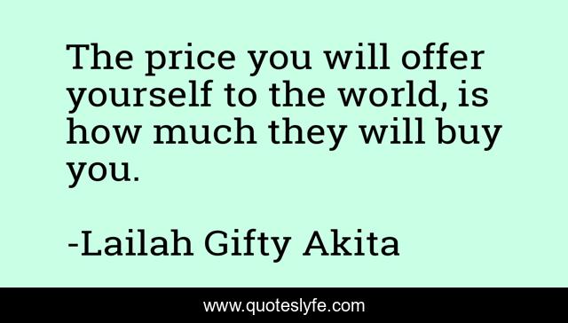 This page presents the quote "The price you will offer yourself to the world, is how much they will buy you.". Author of this quote is Lailah Gifty Akita. This quote is about buying-and-attitude, sell-yourself-well, self-love, buy, self-awareness, priceless-dialogue, price, price-of-beauty, buying-power,.
