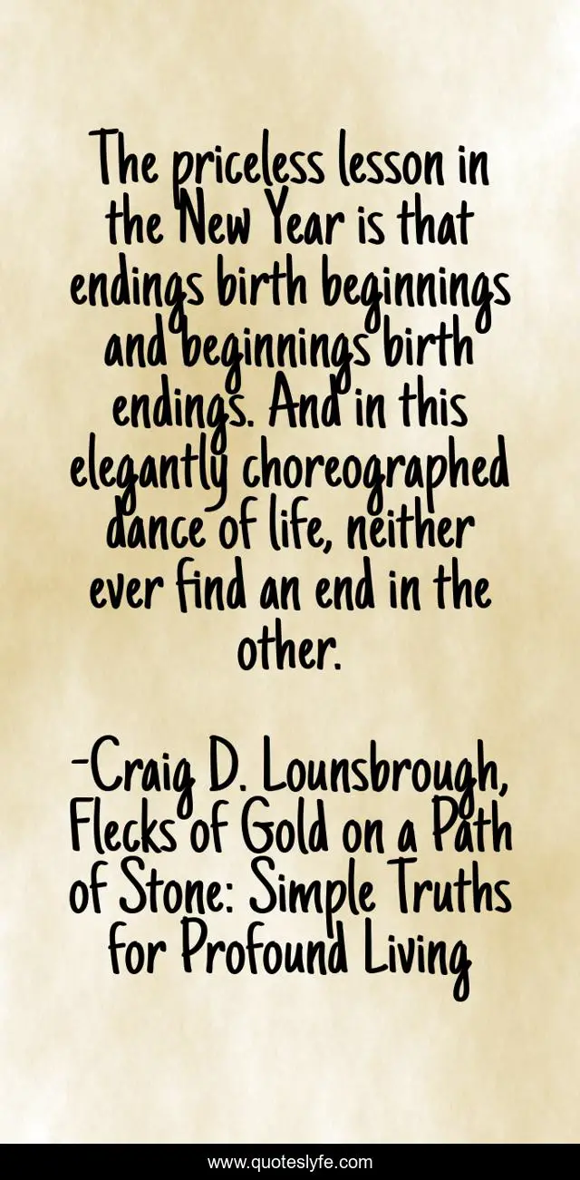 This page presents the quote "The priceless lesson in the New Year is that endings birth beginnings and beginnings birth endings. And in this elegantly choreographed dance of life, neither ever find an end in the other.". Author of this quote is Craig D. Lounsbrough, Flecks of Gold on a Path of Stone: Simple Truths for Profound Living. This quote is about new-year, begin, end, beginnings, dance, new-years, ending, birth, year,.