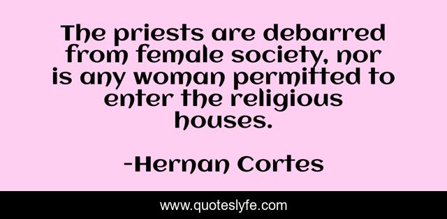This page presents the quote "The priests are debarred from female society, nor is any woman permitted to enter the religious houses.". Author of this quote is Hernan Cortes. This quote is about houses, woman, female,.