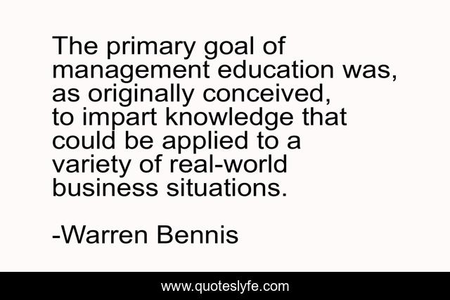 This page presents the quote "The primary goal of management education was, as originally conceived, to impart knowledge that could be applied to a variety of real-world business situations.". Author of this quote is Warren Bennis. This quote is about education, business,.