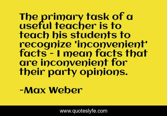 This page presents the quote "The primary task of a useful teacher is to teach his students to recognize 'inconvenient' facts - I mean facts that are inconvenient for their party opinions.". Author of this quote is Max Weber. This quote is about facts, party, opinions,.