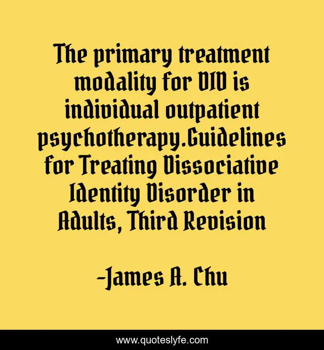 This page presents the quote "The primary treatment modality for DID is individual outpatient psychotherapy.Guidelines for Treating Dissociative Identity Disorder in Adults, Third Revision". Author of this quote is James A. Chu. This quote is about psychology, dissociative-identity-disorder, dissociative, mental-disorder, multiple-personality-disorder, psychotherapy, dissociation,.